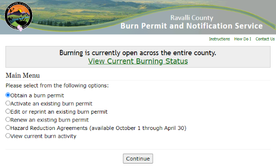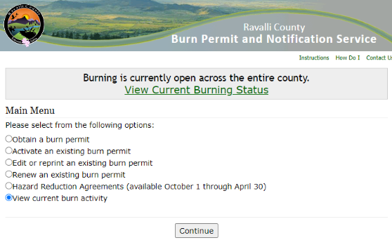 Outdoor burning in Ravalli County is open on a day-to-day basis through Tuesday, November 30, 2021. You may check daily burning status through our Burn Permit Program at https://app.egovmt.com/burnpermit/.